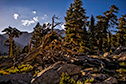 Sunset, Kaweah Gap New Moon over Lawson Peak Upper Lake, Nine Lakes Basin Tree, cliffs, Nine Lakes Basin Lawson Peak, Sunrise